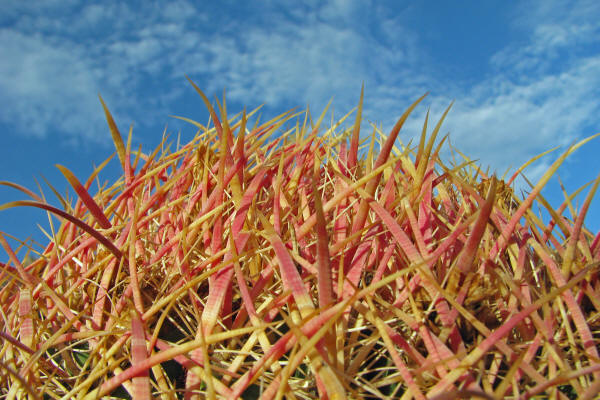 Barrel Cactus spines meet The Sky I love when certain earth elements combine with sky elements. So much contrast yet so much harmony. The red-peach-yellow gradations of color really do something to me, especially against the blue and white of the sky. This image clearly shows the curved nature of the Barrel Cactus spines, one of the few cacti in The Park that have such a feature. This, along with the fact that the ends are not barbed, makes for one of the friendlier cacti around. When my niece and nephew were young, this is the cactus that I used to teach them about the sharp nature of cactus spines. With my guidance I had them lightly touch the end of one of the spines, feeling the sharpness. They each had a brief "ouch" experience that was superficial and enlightening. Soon they were gently feeling other spines on this cactus, exploring its power. They learned to respect and admire the cacti of The Park, without the fear that is often associated with them. This colorful cactus image is yet another great example of the masterful artistic compositions that fill The Park. Thanks for sharing so much beauty with us : ) |