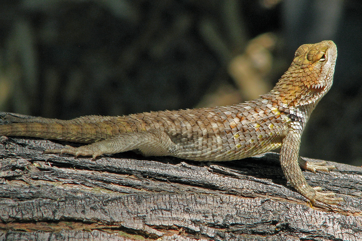 Desert Spiny Lizard, female Keep looking up and into the light! What a magnificent little creature we share the earth with. Look that that face, so alert and so deeply connected to source. They're also much older than we humans are, and appear very comfortable on this planet. This is one of the many lizards that make The Park home. This is a medium-sized species, considerably smaller than the Chuckwalla and Gila Monster. The colorization of the Spiny Lizard can be quite varied. This particular one is mostly browns and yellows and whites. I've also seen blues and greens. The males are quite a bit smaller than the females, and less colorful. It's funny how such variations happens in nature; sometimes it is the male who is larger and more colorful, sometimes it is the female who is larger and less colorful, and sometimes it is the male who is smaller and more colorful. My guess is that this particular surface-crawler is female, and what a beauty she is : ) |