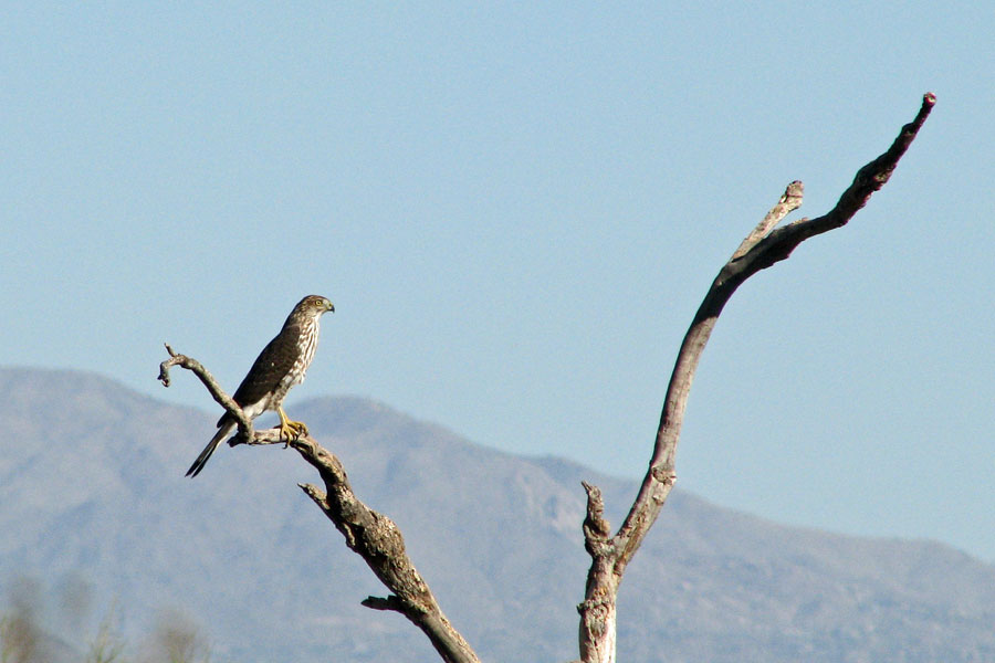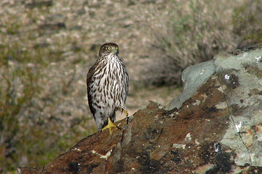 Coopers Hawk looking for lunch I encountered this handsome bird a few blocks from my house, where The Park juts out to the north. I never realized how fully patterned the breast is, completely covered in brown designs. It looks a bit like some kinda something swimming in a downwards direction. I love the eyes of the predator birds. They seem so wide opened, taking in oh so much of what is going on around. It looks like this bird spotted something, and is taking a step to set-up for take-off. Maybe lunch today will be a quail, or a dove, or maybe it will be a Spiny Lizard, sitting out in the open on a rock catching rays.