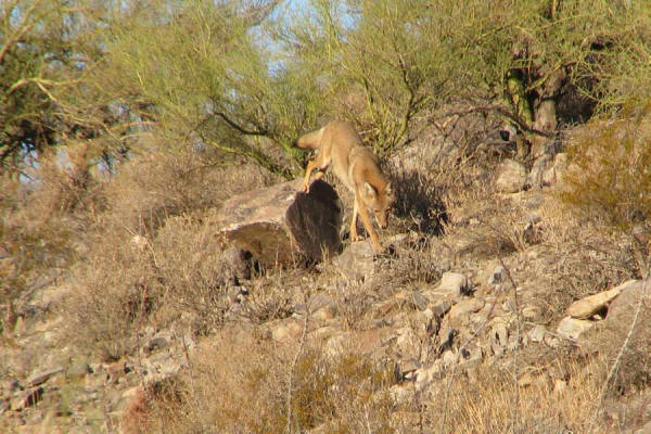 Coyote Here is one of a pair of Coyotes that I encountered. I was tipped off to their arrival by a couple of jackrabbits that were running along in an unusually speedy fashion. The Coyote in the photo stood up on the rock hoping to get a glimpse of the rabbits, but they were out of sight by then. The Coyotes moved quickly down the mountain to the flat areas, and were soon out of sight.