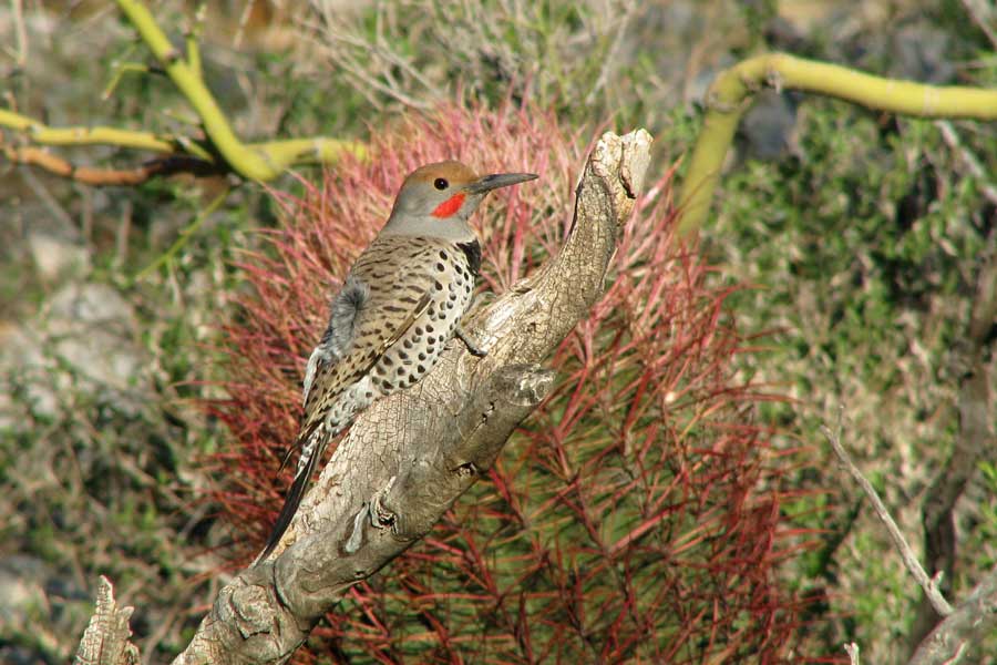 Gilded Flicker, male Here is another of The Park's great beauties. You can tell he is a male by the red face paint. All 3 varieties of woodpeckers in The Park use red to mark the males, with the Gila and the Ladderback marking located on the top of the head. This guy was busy pecking on this snag. I can't figure out why. It didn't seem like he was doing it for insects, more like he was just doing it to do it. Maybe it helps keep his beak ready, or maybe it just feels good. I think it is because it feels good on his brain. Anyway, it was sure great to watch and hear him go about it. Below is a video clip of the pecking in action. |