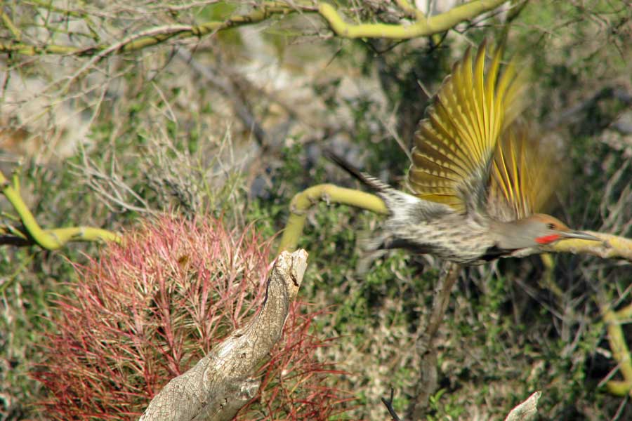 Gilded Flicker, male Here he is again, just after take off. In this shot it is easy to see why they are called Gilded Flickers, with that magnificent golden color on the underside of the wings.