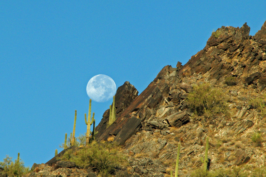 The Moon gets some Desert Love I enjoy watching and capturing images of the Dancing Moon...seemingly prancing along and down the profile of the mountain, being caressed and held by the rocks and cactus as she does. I love it when the celestial and the earth meet...something deeply calming and peaceful.
