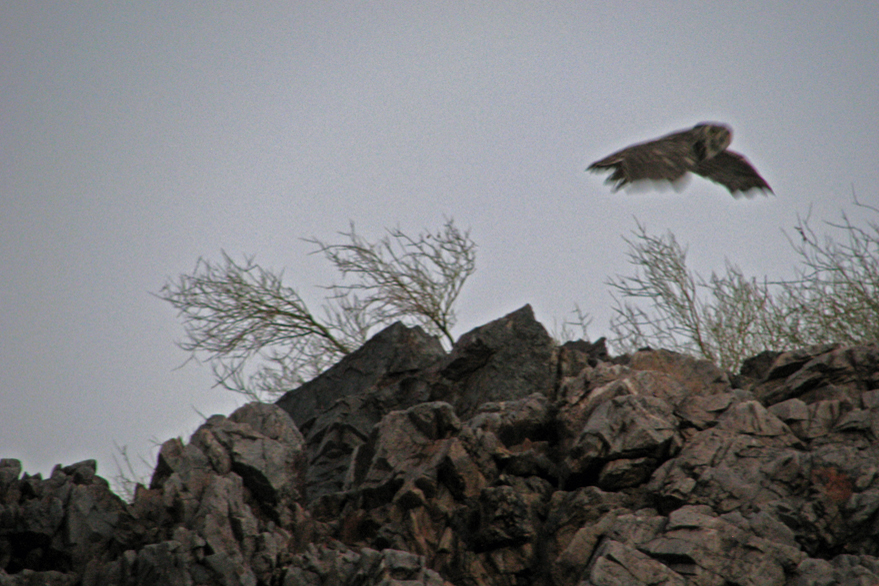 Great Horned Owl taking flight I went for a walk in The Park the other evening. At one point I looked up to the left and saw this critter perched on the rocks above. She (?) was peacefully looking around, taking in the sights and sounds that surrounded her. I like how she has some resemblance to a bat in this image. Owls are one of the quietest flyers in the world. They have special sound-deadening feathers incorporated into their design. These feathers give the owl an especially silent and stealthy hunting posture. I wonder how many small animals have became owl food because of this feature, where otherwise they would have scampered in time. It is interesting to notice the different tools that are in use in the natural world. Others that come to mind are: the Zone-tailed Hawk that looks like a vulture when flying above; the Wind Scorpion with the large 'arms' that look like a scorpion's claws; and the butterflies that have faces painted on their wings, so that when they are sunning, they look like s big face with large eyes. The wonders of it all... |