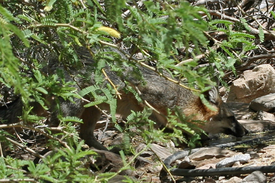 Grey Foxes out walking a ramada This is the second Grey Fox encounter that I have had. There were 2 of them making their way around the picnic tables. The way that they walk is so cat-like, so elegant, so flowing. They are like creatures from a different planet, or another part of the world. Those tails are so very long and expressive...mesmerizing. I hope to capture some clear images in the future, but for now this is what I have to show. There sure are a lot of interesting characters that make up the whole of this incredible space. Such an exhilarating and surprising experience, even from a distance. |