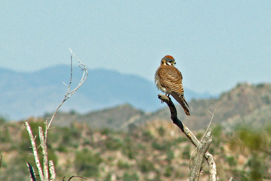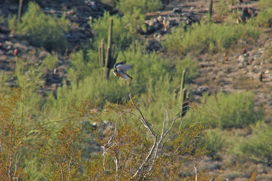 Female Kestrel I had been hoping to see another Kestrel, so it was with excitement that I photographed this beauty. She was busy flying around the desert looking for something to eat. She did capture a tidbit, but I were unable to identify what it was. I've seen one eat a caterpillar and a lizard before. These are the smallest falcons in North America, about the size of a White-winged Dove. click on any photo to see a larger version.