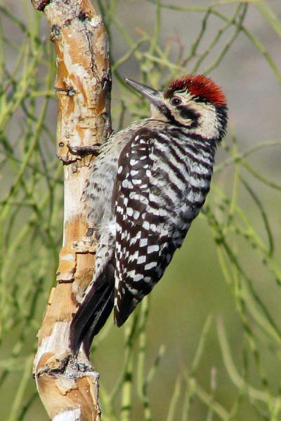 Male Ladderback Woodpecker It is always a treat to come across one of these beauties. The Ladderback is one of 3 woodpecker species in The Park. These are especially active, and spend a lot of time on the ground. Ladderbacks have one of the most interesting pattern designs of any critter in The Park. There is the swirly face paint, which reminds me of the middle portion of a rolled ice cream cake. Then there are the delicate white spots on the front of the red cap, like paint splatter from a fine brush. Then there is the back...so much going on there...the stripes, the dashes, and the spots...oh my! What an impressive and fascinating outfit you wear Mr. Ladderback!