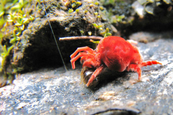 Velvet Mite This little critter, about the size of my fingernail, is doing one of the jobs that Velvet Mites do: eating grasshopper larvae after a rain. These creatures only appear after the rain in the warmer months, and only sometimes. They really stick out from the browns and grays of the ground. I wonder why they have such thick fur, like a cuddly teddy bear. What a stuffed animal this would be in huge scale, like a queen bed : ) I am fascinated by such creatures. I admire it as a great fellow earth dweller, as one of the trillions that grace our planet, participating in the elaborate and symphonic balance of nature.