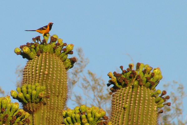 Hooded Oriole, Male What a delightful encounter this was. I was walking along a trail in The Park near my house, an hour before sunset. About 90 feet away I noticed a bird atop some Saguaros, digging into some buds. At first I dismissed it, thinking that it was a Mockingbird, with the white slash across a black wing. I did notice the yellow color, but figured it had to do with the setting sun. I looked a couple of more times I decided that there was just too much yellow for it to be The Sun, so I started shooting away. Good decision... I have only seen the Hooded Oriole twice in The Park before, and these new images are way better than those from the first encounter. It helps to be a mere 90 feet away, instead of 150 feet away. Thank goodness for long zooms! It feels great to have some Oriole images worthy of printing. I'm tickled that he is on a budding and blooming Saguaro cactus, an unusual combination. How I love the Sonoran Desert visitors : ) |