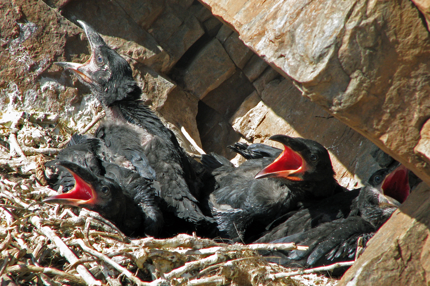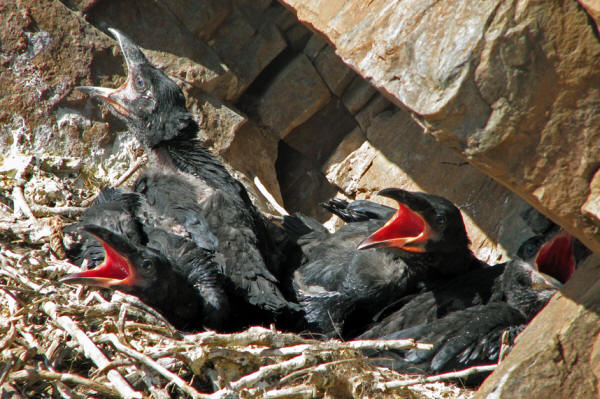 Raven babies way up top These youngsters spent their formative weeks just under the highest point in The Park. I have been told that they open their mouths to let out heat, as well as the eating thing.