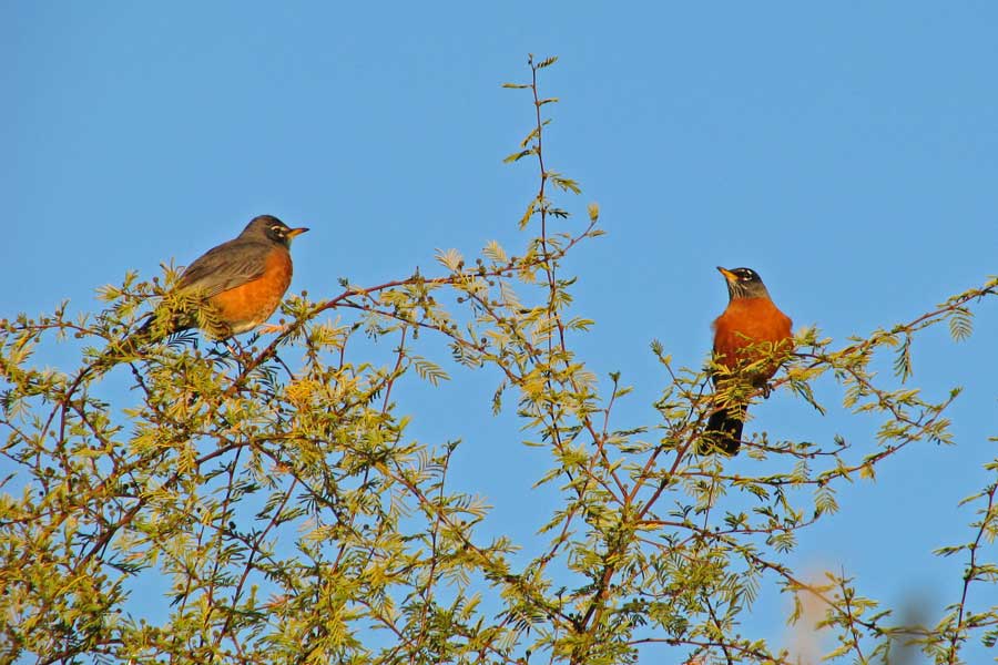 American Robins They have arrived, and they seem to like it here. It has been a few weeks now that the Robins have been running around The Park. The American Robin is normally found in the higher elevations, making their visit a special treat, and it is good to have them hang around for a while. This looks to be a couple, with the male on the right and the female on the left. As with many bird species, the male has more color than the female. Thanks for visiting us oh flitty ones... |