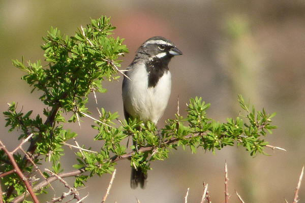 Black-throated Sparrow (Amphispiza bilineata) What a distinctive face painting this classy looking bird has going on. I love the subdued coloration, made up of nothing more than gray, black and white. That is quite a classic look, like a serious business suit. This sparrow is a member of the Songbird group of over 4600 birds across the globe. Some have just one song, while others have more. Of this group, the Thrasher is the king with over 2000 different songs! The singing of a bird is so different from the way a human sings. The produced tones are so pure and melodic, and executed with such precision. What a beautiful meditation possibility such an encounter presents, to simply stand or sit with your eyes closed, and be carried away by these magnificently performed songs, like a beautiful dance for our sense of hearing. Such a meditation can be especially dynamic when a songbird like the Mockingbird or the Thrasher let loose, with their hefty repertoire.