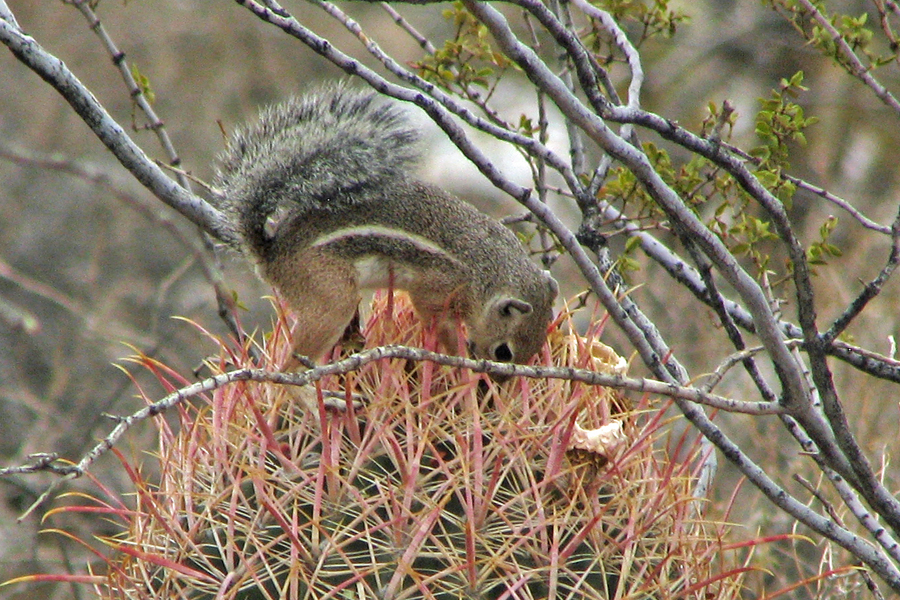 Antelope Ground Squirrel atop a Barrel A squirrel on a cactus is one of the funnest shots in The Park. I am always on the look out for it. When it happens, it is usually over very quickly, and all you have to show for it are a few fuzzy images. Every now and then this episode will extend, as it did in this instance. This little critter was up there mining cactus fruit for about 90 seconds. It is amazing how easily and quickly these Squirrels climb up and around and down the various different type of cactus in The Park. The Barrel Cactus must be one of the easiest ones to climb, with their "friendly" spines that are turned in at the end. I have seen these critters climbing around in Cholla cactus, which have a very sharp and barbed ends. In there, the squirrels climb around with a lot more delicacy. When you think about it, this is an incredible scene. What athleticism, what toughness, what balance, all in the flow of a day under the sun, part of the beautiful symphony of instruments...a masterpiece. |
