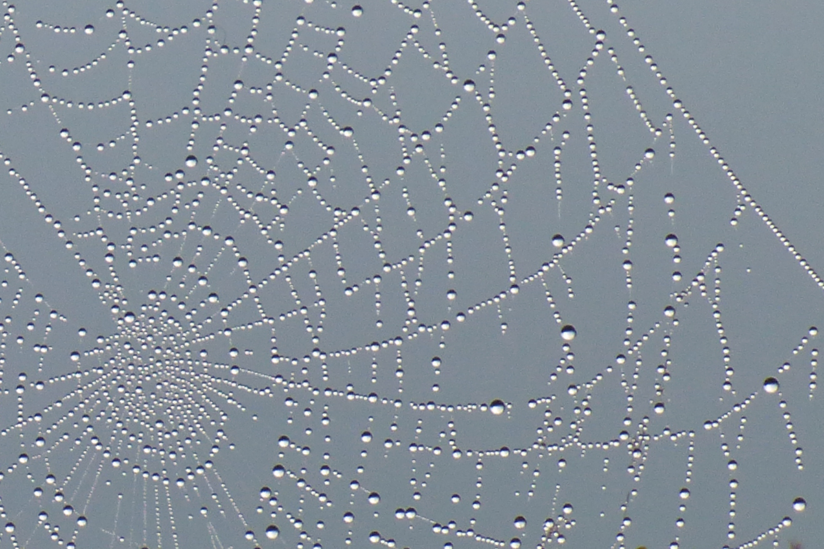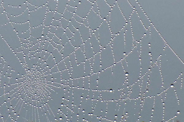 From the Fog emerge Strands of Jewels On Super Fog day, last Sunday Feb. 1, I was fortunate to encounter something for the first time: several spider webs hanging in Palo Verde trees, each carrying hundreds and hundreds of micro water-droplets. Fog is a great way to deliver water to these delicate webs, doing so with a gentleness that allows the webs to hold onto them without breaking or dropping, even as they enlarge. These bejeweled spider webs were completely invisible against the white sky. It wasn't until I stepped up to a dark background did they emerge. There were about 6 of these webs strung across 3 trees that were visible from my vantage point. Even with the dark-ish background, they are still kinda tricky to see. Thank goodness for photography. As much as I looked at these webs while I was out there, I couldn't see how amazing they really were. It wasn't until the images were enlarged that the fine detail of the suspended droplets became real to my perception. This image to the left is a crop of one of the larger webs that I photographed, at about 5" in diameter. Some of the droplets are so tiny that a grain of salt would likely dwarf them. I did a rough count of the number of strung-out spheres in this crop; nearly, if not more than, 1000. There are many jewels in the desert that are easy to miss : ) |