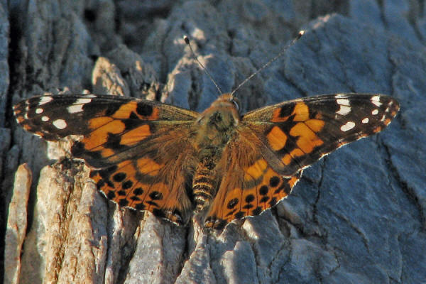 Painted Ladies acting most un lady-like I had the privilege of hanging out with at least 4 of these critters for over an hour the other day. One conclusion that I've reached on them is; they play hard! For the hour that I observed, they were busy doing one of three things; 1) aerial boxing with other Painted Ladies and other flying insects, 2) looking for a nice place to land and catch some Solar rays, and 3) catching rays. Here's how it went. One would land on the rocks and open her wings, then fine-tune her aim right towards the Sun. There she locks on, and holds that position in seeming bliss, until another butterfly flies nearby. When that happens, the sunbather bolts into action, going right at the trespasser with great voracity. Several times, when this happened close to me, and I could hear their wings hitting each others. It was like an aerial boxing match. Most of the time there was a pair going at it. Sometimes a third would join in, and a few times I saw four of them going boxing away and holding it together for about 10 seconds. Fun : ) |