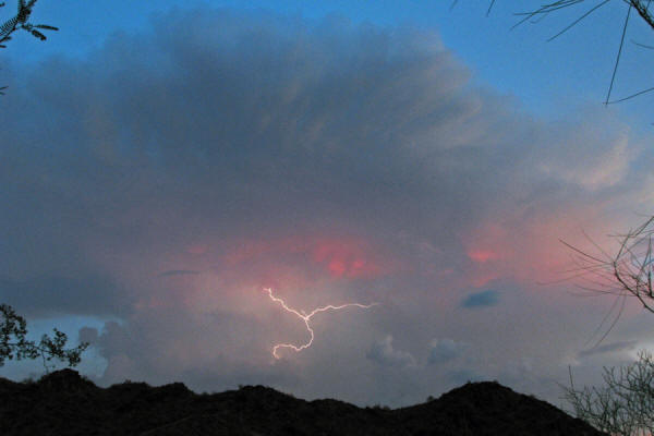 Summer rain is a wonderful thing! What a nice stretch of weather we have been having. It is an excellent example of the power of contrast. The week before the storms hit, Phoenix had 7 days of hot, where the temperatures did not fall below 90 degrees. Still, a lot of storms have come close, then turned back around and left. That has been the story of our monsoon season over the past several years. Thankfully, this year, a number of storms actually made it here, and some of them were significant. This photo is from a storm that did not make it here, but was close enough to photograph. It was interesting to observe this smallish and isolated cloud with major activity within. And right next to it was a smaller cloud with similar activity. It was beautiful to watch, and very challenging to photograph. I took over 480 shots in order to land 4 good ones, which comes out to less than 1%! Thank goodness for digital cameras : ) |