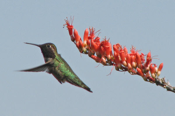 Anna's Hummingbird and her lovely Ocotillo bloom friends The Hummingbirds sure love this particular cactus species. It's lovely to watch them work through each grouping, poking into each of the blooms with precision and speed, like a high-tech machine, yet beyond any machine that we can build. Their alertness and quickness and aggressive nature make for a unique character. I get the feeling that the nectar from this flower tastes amazingly good to these fearless flyers, kinda like the bear and honey. They can often be spotted using the ocotillo branches as perches. The 'thorns' of this cactus are not thorns at all, but leaves that are rolled up tight. These have gotta be some of the sharpest leaves around! I love seeing such bright and contrasting colors harmonizing in The Park... |