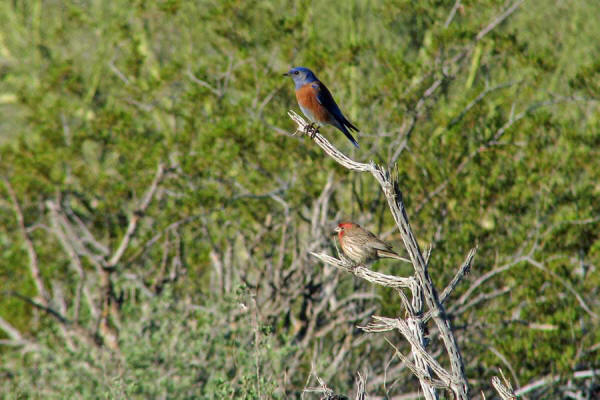 Male Western Bluebird with a Male House Finch Well, the Blues are still with us. It has been 7 weeks since the first encounter, and they still seem to be loving it here. It makes me wonder if they have set up shop in The Park, with nests and all. I love getting 2 different species in the same shot. There is something about the contrast and compare, especially when they both have some nice color going on. The Finches and the Sparrows seem to enjoy having the Bluebirds around. I will often times see them hanging out with these colorful visitors.