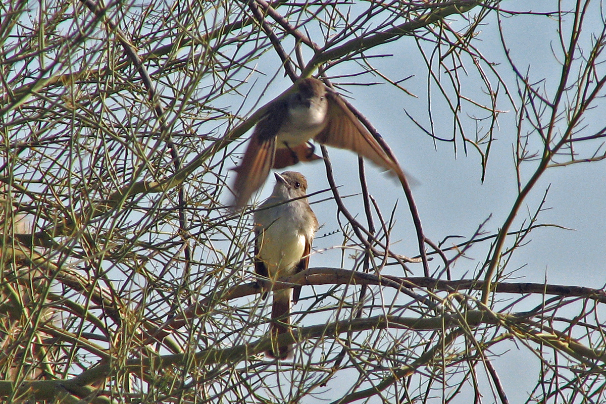 Ash-throated Flycatcher pair These birds are some of the finest flyers in The Park. Watching them hunt bugs out of the air can be very entertaining. Their agility and aerobatic ability are among the best in The Park. They are also quite aggressive. I've seen them chase birds of all sorts and sizes, and have never seen them being chased by another bird. I can imagine a Thrasher or Mockingbird would take a shot at them, but I haven't seen that happen. They have a bit of yellow on their bellies, which really stands out in the right light. This can be seen on the perched bird shown to the image. I sure love seeing such flashes of color. There are a lot of different flycatcher species in The Park, and these are one of the more prolific. Below is a video of these two do doing their thing. In the video, I like how the second one flies into the picture at 28 seconds, then they both hop around until they find a comfortable position. Once settled in they get about to the business of preening, with some nice singing mixed in. Thanks for sharing some of your day with me : ) |