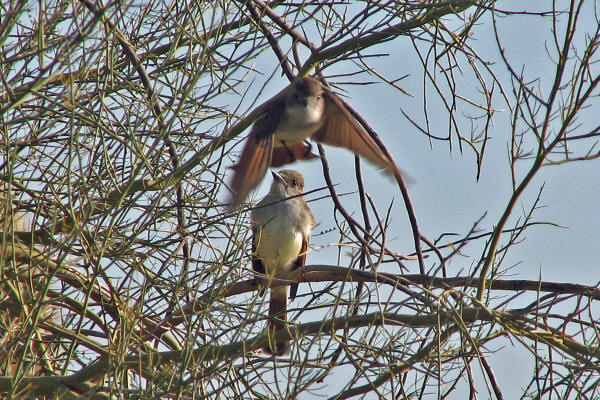 How I love watching and listening to animal couples going about their daily affairs. They are all so different from one another, even those who have a lot of similarities. For example, the Mockingbird and the Ash-throated are similar and different. They are about the same size with the Flycatcher being a slightly larger. They both catch and eat bugs right out of the air, also known as eating on-the-wing. They are both exceptional flyers. They are also some of the most aggressive critters in the entire park, in different ways. The Mockingbird will go after a wide range of animals, including Coyotes. These attacks are light in nature, usually a repeated series of pecking flybys.The Ash-throated goes after other birds only, as far as I have seen. Also, their attacks seem more forceful, like they are intent on hurting the other bird. I have seen them dominate one of the finest flyers in The Park, the Lesser Nighthawk, which looked pretty freaked out during the encounter. The greatest differences come by way of songs and markings. |