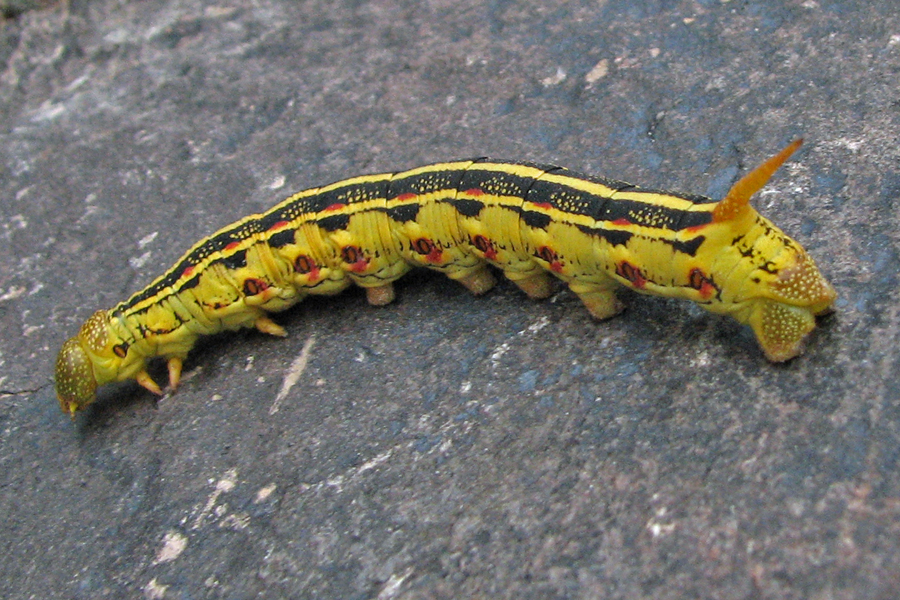 Larva of the White-lined Sphinx Moth These critters were out in force on 9/08/08. I must have seen thousands of them. They were around for a few days, then they were gone, and I haven't seen them since. They were about 3.5 inches long. Thanks to my friend Walt Anderson (GeoLobo.com) for identifying this critter for me. I had originally suspected that it was the larva of a Rustic Sphinx Moth, a critter I photographed a few years previous. The coloration of this caterpillar is impressive. The accenting use of red against the yellow and black is striking. I would love to know why and how this particular and complex color pattern came to pass. Look at how odd the legs are. In the front they are spindly, and in the back they are like pillars with suction cup ends. When I print this image to 6' long, it looks like a creature from another planet. Here is a link to more info on the White-lined Sphinx You never know what you'll find in The Park... |