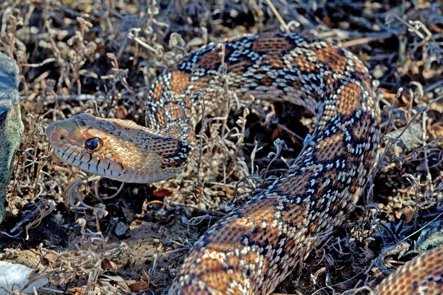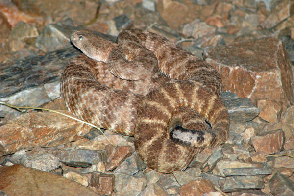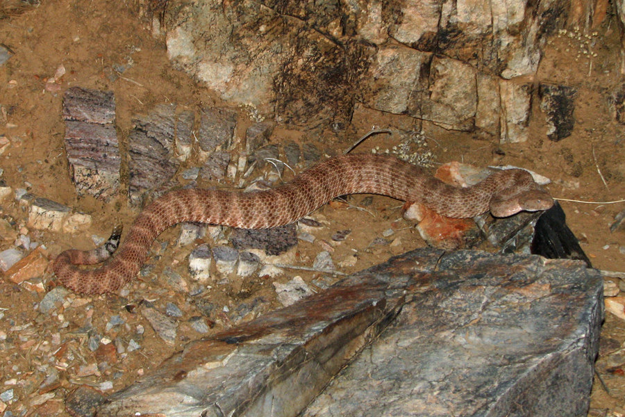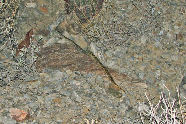 May 4, 2009 8 am Well, what do you know. About 10 hours after my first rattlesnake sighting of the new year, another finds its way to my path. This one is an adult, about 5 feet long, contrasting the youngster below. She (?) didn't rattle a single time, though she did pull herself into a coil. After about 12 minutes of photographing her, she slid off into a bush, completely invisible. Makes you wonder how many are out there in the bushes that we never see, that never rattle at us.
