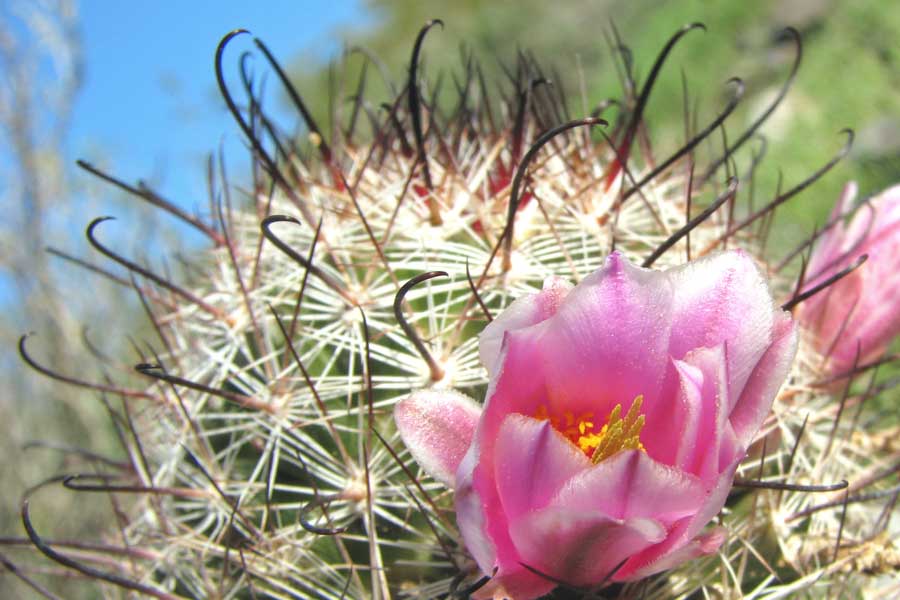 Fishhook Pincushion Bloom Here is the first pink bloom of the year. I was surprised to see this one. These usually don't bloom till it gets warmer, but it looks like we had enough warm days in a row to flip the switch. These blooms are some of my favorites. They are so bright and so delicate, and grow out of such an overly protective source. Notice the 2 layers of pointy spines on the cactus. The first layer is made up of 'stars' that fan out, covering most of the skin. The second level of protection comes from the fishhooks, which are quite sharp. The red at the top of the cactus looks like blood, and is the point of creation for the new cactus skin and spines. |