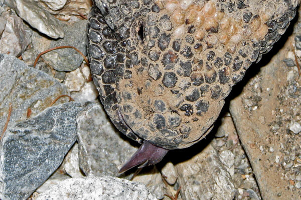 Gila Monster's forked tongue Just like their snake cousins, Gila Monsters use their forked tongues to smell the air for potential food opportunities. Most of the time they flick their tongues out every so often, like keeping their ears open. Then sometimes they flick their tongues rapidly, and one can sense their excitement of a possible meal lurking nearby. Click on photo to see this particular split tongue more clearly. |