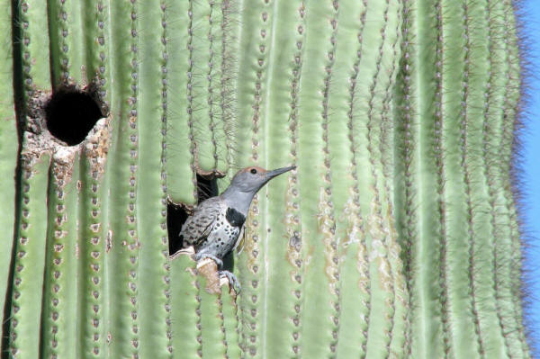 Female Gilded Flicker These birds have become one of my favorites to photograph. I love their formal attire, with the big black bowtie. It is interesting how the female has no face paint, while the male has a great red slash across his face. There is something special about the entire woodpecker family. It is very interesting how different they are from one another, even with all of the similarities that they share. So far in the park I have seen the Gila Woodpecker, the Gilded Flicker, and the Ladderback Woodpecker. |