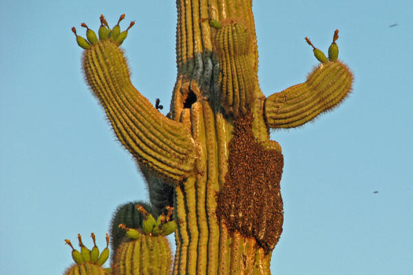 Bees who call a Saguaro home I have encountered several bee colonies out in The Park, but this is the first time that I've seen them using a Saguaro. The others that I have observed were built in the rocks. At first this looked like some kind of growth living on the side of this cactus. It caught me off guard. It was fun and interesting to watch this mass move around, and to listen to the intense buzzing going on. Thank goodness for the bees... |