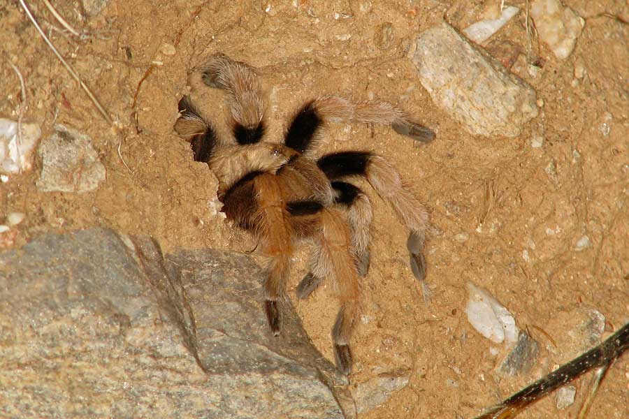 Mexican Blonde Tarantula, probably a female Finally I get an experience with the great Tarantula. I came across this beauty last night. She was busy hunting, using her hole as cover. We hung out for about 45 minutes, during which time she came out of the hole twice, then zoomed right back into it. I am amazed that it took me so many years to see my first big hairy spider. I haven't heard of any sightings in the park. I have seen the Tarantula Hawk Wasp here, so I thought sure there were some around. Her colors work so beautifully together. It really took me by surprise how strikingly stunning she was, how alluring her beauty. |