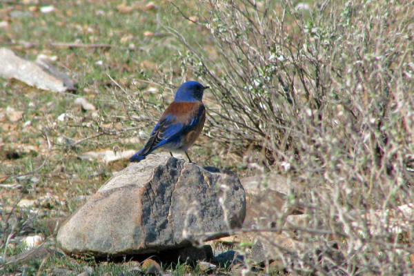 Western Bluebird, male It has been great fun watching and observing the pleasant Western Bluebird these past 3 weeks. One of the best parts is when they fly. That's because when they fly away from you, all that blue on their back side lights up, at its maximum. Experiencing such a dynamic flash of blue in the winter desert is quite a tasty treat. This photo illustrates the amount of blue on the back of the male. When he takes off, he appears to be saturated with blue. click on the photo for larger version