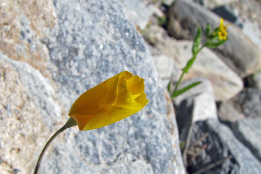 Mexican Poppy Here she is with a fellow yellow bloom behind. Looks like there is going to be a whole lot of yellow soon. Yellow does seem to be the dominant color for desert blooms. The Creosote bush can have thousands of little yellow blooms on one plant. Others include the Palo Verde tree, the Staghorn Cactus, the Barrel Cactus, the Brittlebush, and more and more...
