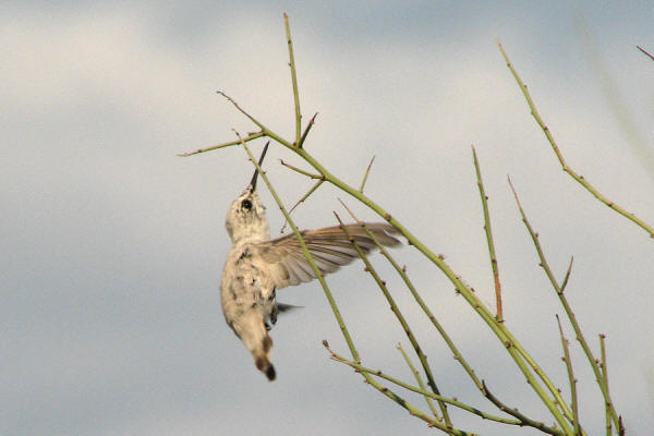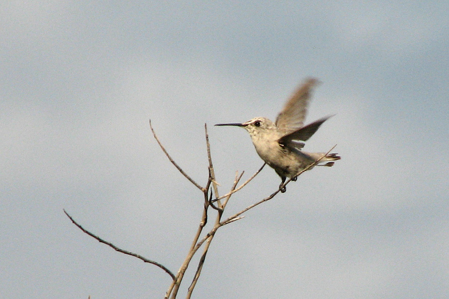 | The tricky part about photographing hummingbirds is their size. It can be difficult for the camera to focus on that tiny area, and will instead focus on something else. This happened a number of times, then finally, after about 7 minutes, I was able to get some good captures...not as good as I wanted, but good enough. Then she was gone, out of my life as fast as she came into it. It was a tasty end to my morning in the field. | ||