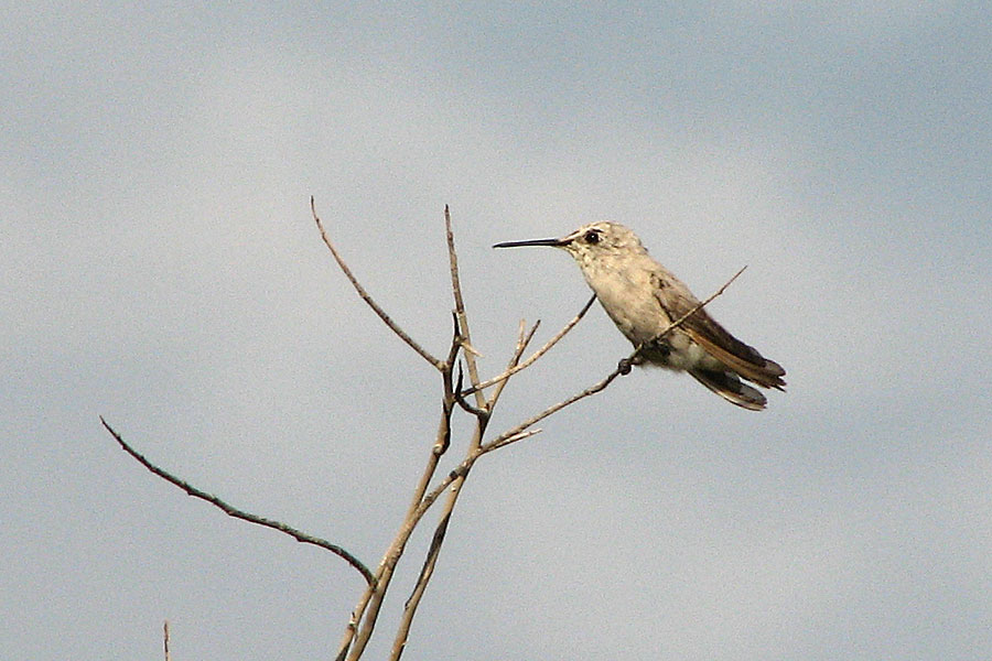 'White' Hummingbird This tiny bird flew into my life, during a time when I didn't have much to spare. I tried to make it happen quickly, but she (?) would have none of it. If I wanted to capture her image, I was going to have to work for it. So, even though I was in a hurry to leave, I followed her. She was very flighty, landing for only for a few seconds at a time and then moving on. Finally I got ahead of her, and she flew in. My opportunity arrived, and I captured it. What a beauty, and a little larger than the others, chasing them away. Thank you for the experience. |