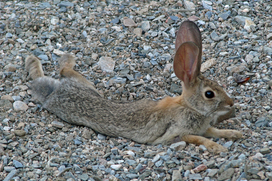 Cottontail This furry beauty was cooling off and relaxing during the late afternoon. I love how he just flops his feet back behind him, getting his whole under-region in contact with the earth.