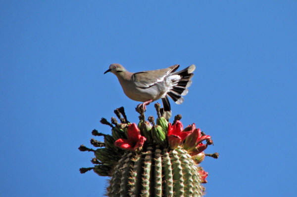 White-winged Dove, flashing some tail. Is this Dove showing off her beauty for the camera? Nah, she was using what she's got to keep her balance on a windy day. Like most desert animals, these birds have incredible balance, far superior to humans. Even in the wind they rarely ever take a step to save it. This is a good representation of the split-second moments that pass us by, day after day. They are just too fast and too many to keep up with. It takes something like stop-motion art to enable us to examine and experience the deep beauty that surrounds us in everyday things. |