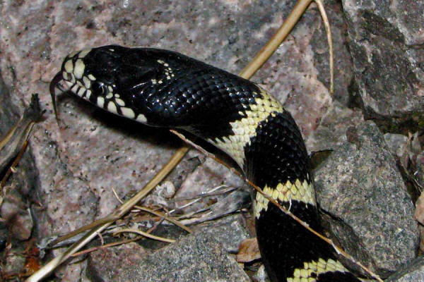 California Kingsnake, banded Gotta love the Californians, at least some of them! I was most pleased to cross paths with this beauty the other night. He(?) was a little skittish at first, then warmed right up to my presence, going on as though I wasn't even there, with my flashlights and camera flash. We hung out for about an hour, during which he covered quite a lot of ground. At one point he scared the poof out of a little mouse, who quickly bounded away. In researching these creatures, I was quite surprised to find out that they love to eat rattlesnakes! Now that would be quite a dining experience to behold... |