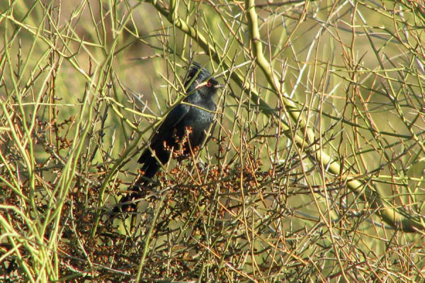 Phaenopepla, male Phaenopepla, male It has been a while since I have heard the distinctive whistle of these black beauties. It reminds me of someone trying to get your attention with single loud mid-tone whistle. It feels a bit like they are saying "over here". This bird is shown perched in the middle of it's favorite food, mistletoe berries. Kissing aside, this stuff is a killer, a parasite that sucks the life out of trees. One of the favorite victims are Palo Verde trees. Sometimes it takes the whole tree down, and sometimes just the main branch. This bird spreads Pt by pooping viable mistletoe onto the branches, where it gets active. |