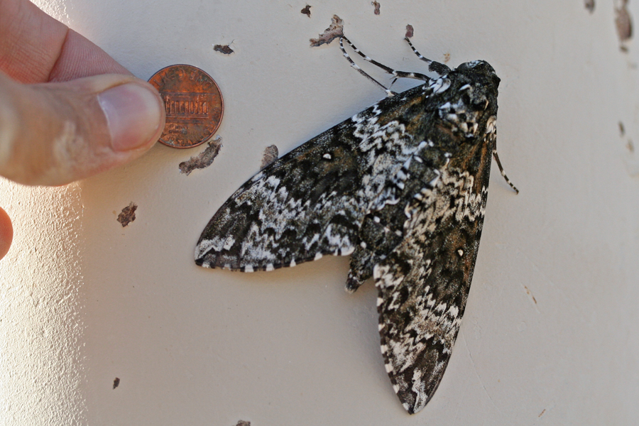 Rustic Sphinx Moth This is certainly the biggest moth that I have ever seen. It was hanging out on one of the light poles by the Rangers Station. I love the myriad of designs on his back. It get even more intense the closer in you go. Click for more info on the Rustic Sphinx Moth