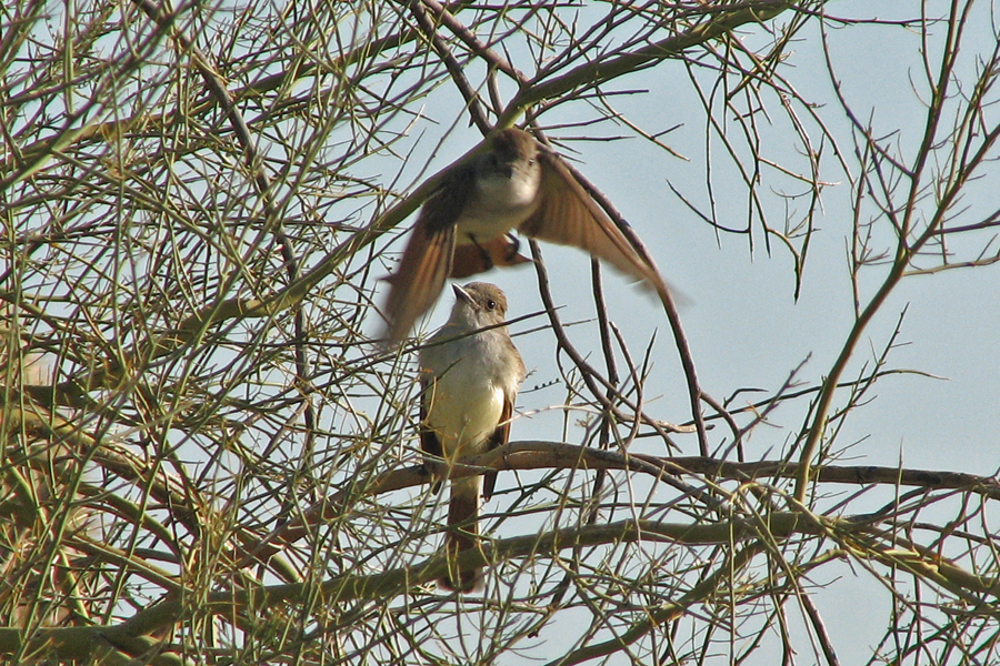 A pair of Ash-throated Flycatchers These birds are one of several different types of Flycatchers in The Park. They are elegant and acrobatic flyers, and are a lot of fun to watch.