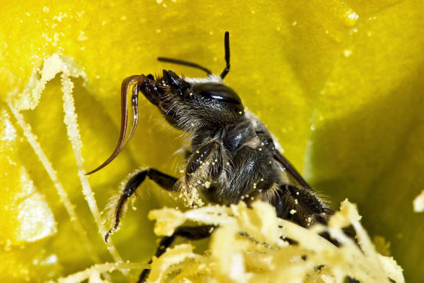 This leaf cutter bee is partying hard in this saturated sun-like blossom. I have never noticed a tongue on a bee before, much less a split tongue, or maybe it is even 2 tongues. These creatures are hugely impactful for the well being of us human animals. Without bees, many of our crops would not produce fruit. We would have to do what a village in China does for its apple trees; they hand pollinate each blossom. These are another great example of the genius design of our earth, of how things work that are far beyond us, and that need to be honored and respected. |