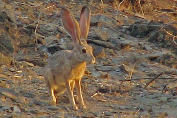Black-tailed Jackrabbit at sunrise This critter belongs to a species that can be very easy to spot in the wild. With those extra long ears and legs, anytime this animal is on the move, spotting is easy. Looking at the Cottontail below, one can see lots of similarities and difference. The Jackrabbit kinda looks like a stretched version of the Cottontail. The Jackrabbit reminds me of the wallaby or the kangaroo. The huge hind legs are very familiar. I have watched and photographed these rabbits standing on their rear feet and boxing, just like the kangaroos. One big difference; with the Jackrabbit, the boxing was very quick and over, too fast to register what happened. When I photographed some boxing Jackrabbits several years ago, and was stunned by the boxing precision that I saw in the captured images, all in a split second. One day I will share the series on Jackrabbit boxing. I am thinking of calling it "Fight Club Jack" : )