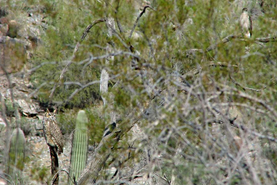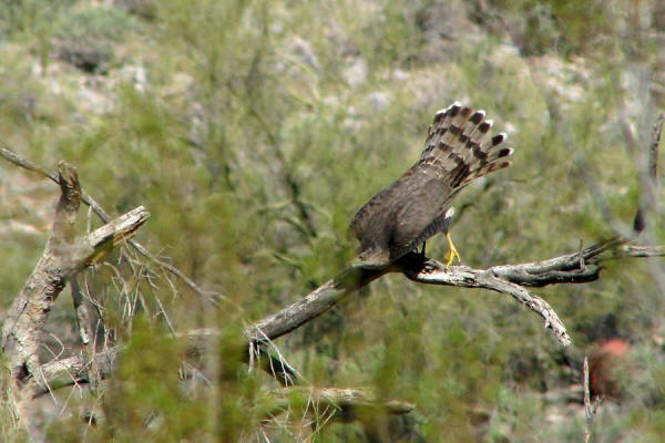 Cooper's Hawk Here he(?) is, about to move in closer to the owl. His tenacity on driving the Owl out was most impressive. The Hawk ended up chasing the Owl out of the snag and about 100 yards away. A bit later the Owl flew again, with the Hawk right behind. This happened several times.