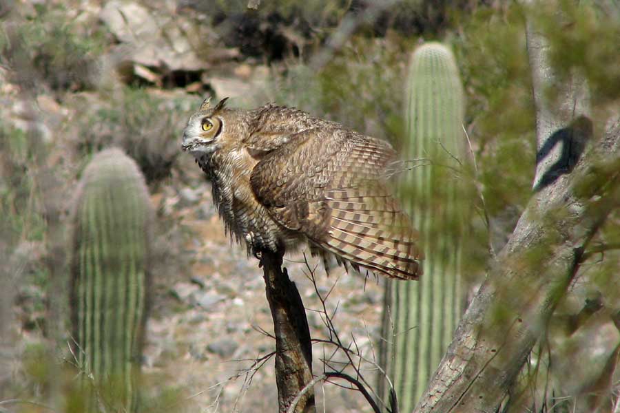 Great-horned Owl fluffing it up Here is the Owl getting all worked up because the Hawk just landed in the same tree. The owl started making a bunch of noise, but the Hawk didn't seem to mind at all. In fact, the Hawk flew in closer to the Owl. |