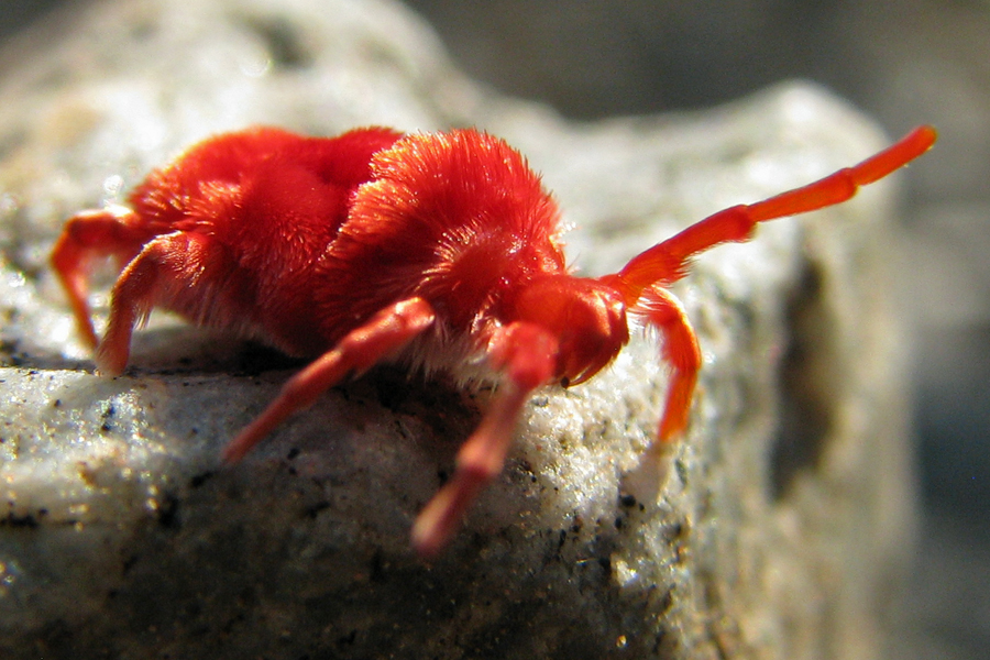 Velvet Mite The Velvet Mites are quite the mysterious characters. They only seem to come out after the rains in the summertime, and only sometimes. I didn't see them at all last year. After the big rain we had the other day, they made an appearance. Hooray for the underground dwellers that make a rare appearance for us to enjoy. Click on the photo for a larger version. recently, alas they made an appearance.