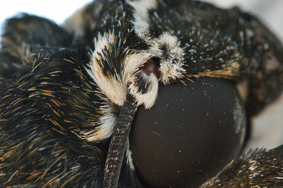 Antennae socket This is one of the most important parts of this critter; an eye and an antennae socket. What kind of critter is this? It is a Rustic Sphinx Moth, about the size of a closed fist. There is an image below for scale. This is the only time I have seen this critter, and boy did he stick out. Click on the photo to see the fine detail of an eye and antennae socket. I love the colors of the "hairs", and how they are distinctive yet blend very nicely. I also love the wavy patterns, like a flowing river, with areas of turbulence and everything. Fun... |